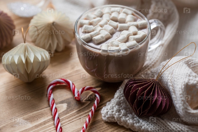 Стильные бумажные елочные игрушки и стакан с горячим шоколадом, зефир на деревянном фоне. Бежевые тона. Вид сверху. Баннер для дизайна, веб-страниц