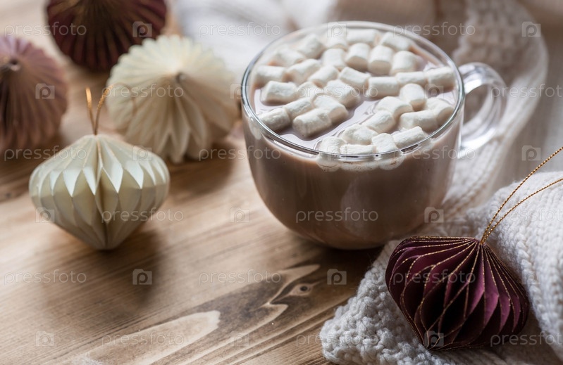 Стильные бумажные елочные игрушки и стакан с горячим шоколадом, зефир на деревянном фоне. Бежевые тона. Вид сверху. Баннер для дизайна, веб-страниц
