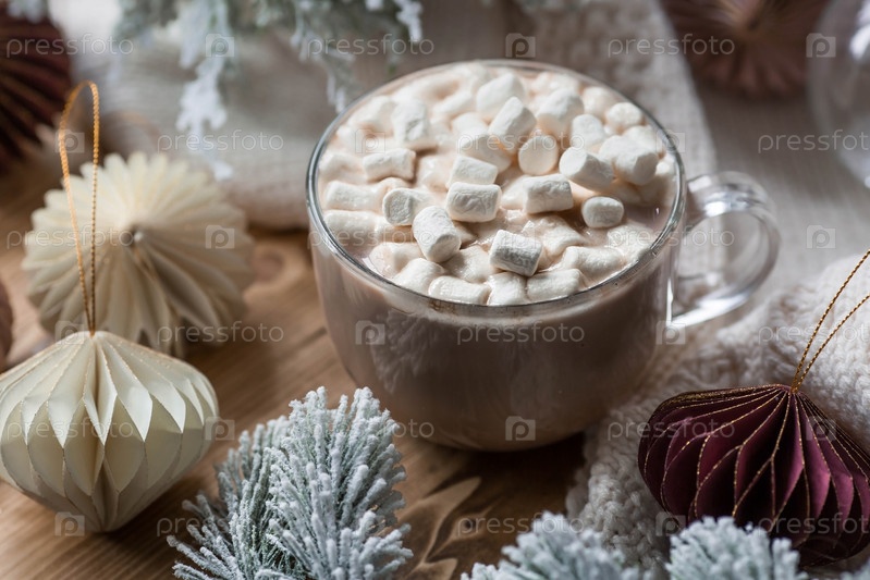 Стильные бумажные елочные игрушки и стакан с горячим шоколадом, зефир на деревянном фоне. Бежевые тона. Вид сверху. Баннер для дизайна, веб-страниц