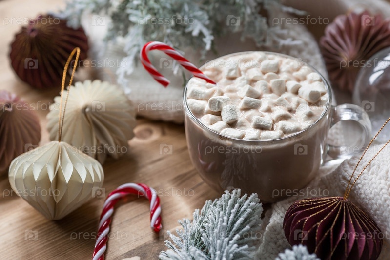 Бежевые тона. Вид сверху. Стильные бумажные елочные игрушки и стакан с горячим шоколадом, зефир на деревянном фоне. Баннер для дизайна, веб-страниц