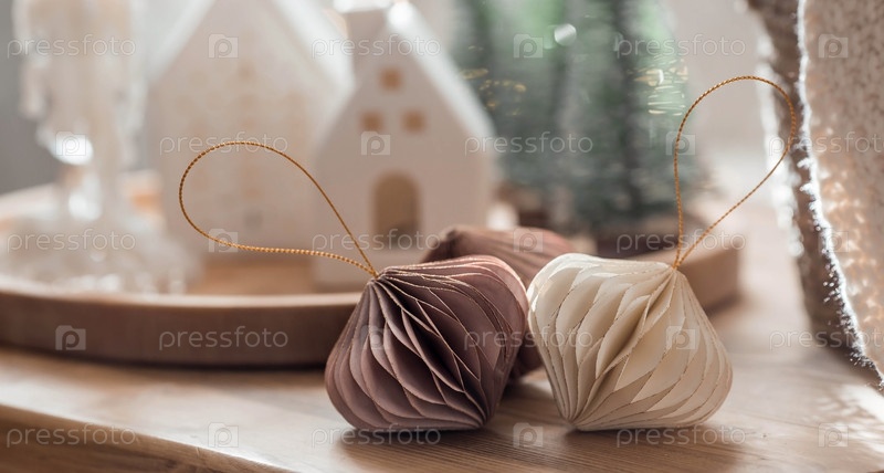 Стильные бумажные елочные игрушки в скандинавском стиле. Бежевые тона. Вид сверху. Баннер для дизайна, веб-страниц. Концепция стильного нового года и Рождества 2023