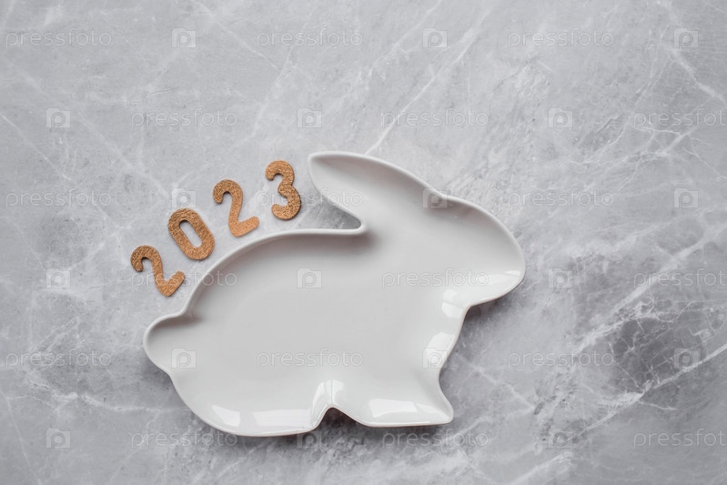 Сервировка стола. Тарелка в виде символа 2023 года кролика на фоне серого мрамора. Концепция счастливого Рождества, Нового 2023 года и ресторанов