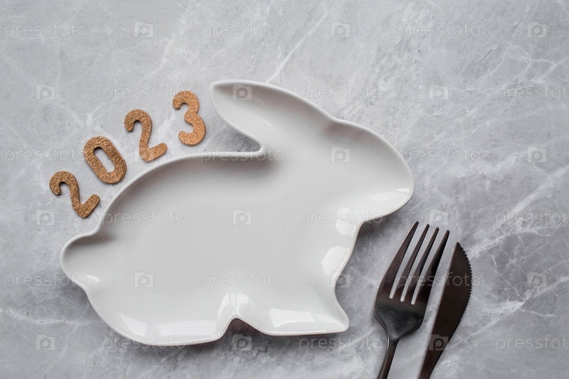 Сервировка стола. Тарелка в виде символа 2023 года кролика на фоне серого мрамора. Концепция счастливого Рождества, Нового 2023 года и ресторанов