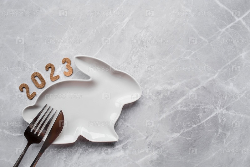 Сервировка стола. Тарелка в виде символа 2023 года кролика на фоне серого мрамора. Концепция счастливого Рождества, Нового 2023 года и ресторанов