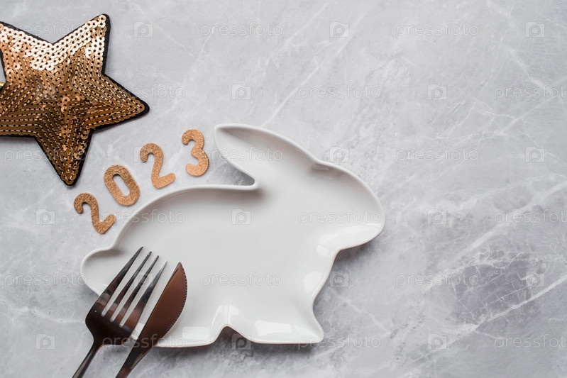 Сервировка стола. Тарелка в виде символа 2023 года кролика на фоне серого мрамора. Концепция счастливого Рождества, Нового 2023 года и ресторанов