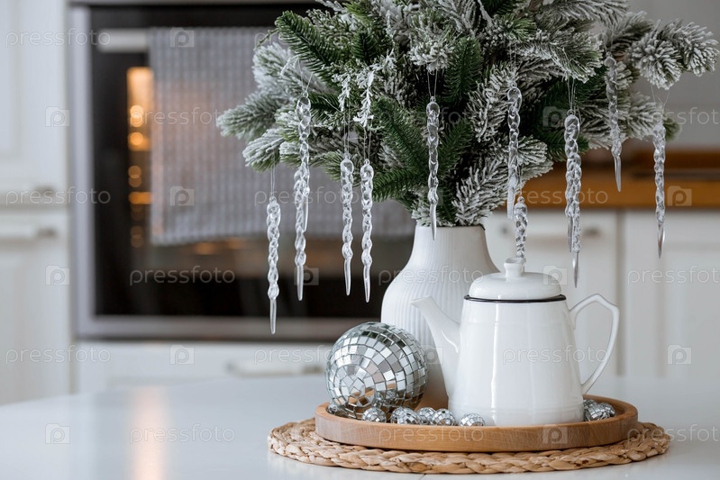 Букет еловых веток с сосульками, свечи и чайник с чаем на деревянном столе в домашнем интерьере белой кухни в скандинавском стиле. Уютная концепция праздничных напитков