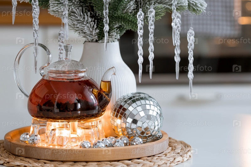 Букет еловых веток с сосульками, свечи и чайник с чаем на деревянном столе в домашнем интерьере белой кухни в скандинавском стиле. Уютная концепция праздничных напитков