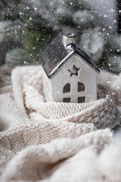 Дом, закутанный в шарф. Зима. Утепление дома, защита от холода и непогоды, система отопления помещений. Энергетический кризис в Европе. Праздничное настроение, Рождество, Новый год 2023