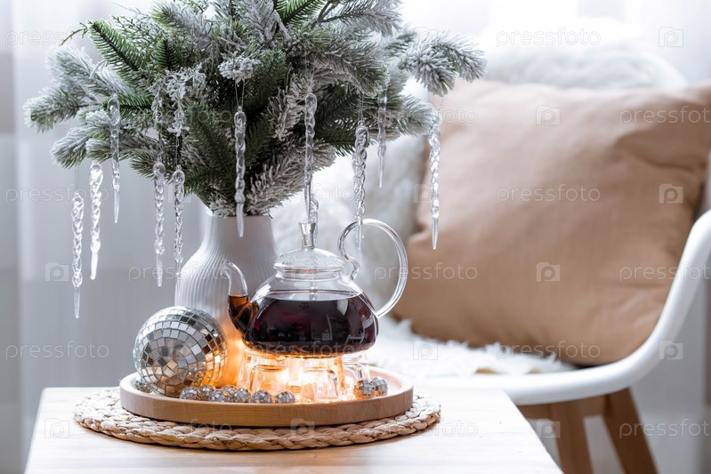 Букет еловых веток с сосульками, свечи и чайник с чаем на деревянном столе в домашнем интерьере гостиной. Уютная концепция праздничных напитков