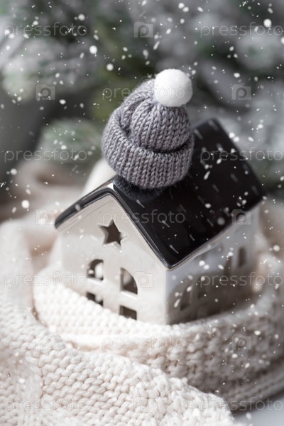 Дом, закутанный в шарф. Зима. Утепление дома, защита от холода и непогоды, система отопления помещений. Энергетический кризис в Европе. Праздничное настроение, Рождество, Новый год 2023