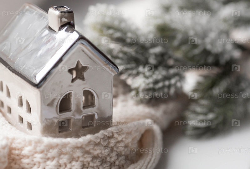 Дом, закутанный в шарф. Зима. Утепление дома, защита от холода и непогоды, система отопления помещений. Энергетический кризис в Европе. Праздничное настроение, Рождество, Новый год 2023