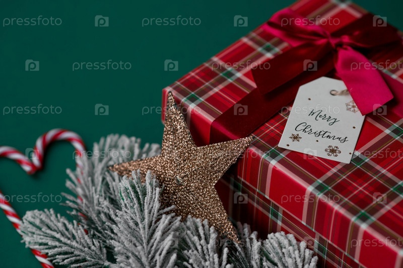 Красная подарочная коробка в клетке, этикетка с надписью «Счастливого Рождества» и еловые ветки на зеленом фоне. Рождество 2023. Традиционные цвета. Покупка и подготовка подарков для родных и близких