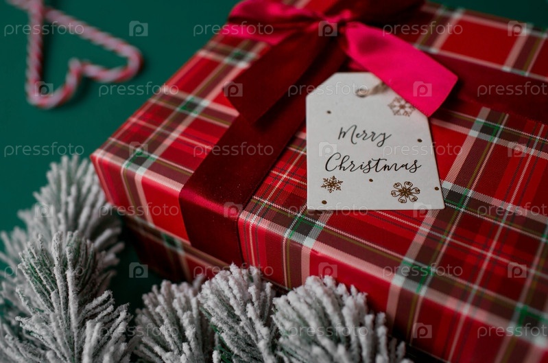 Красная подарочная коробка в клетке, этикетка с надписью «Счастливого Рождества» и еловые ветки на зеленом фоне. Рождество 2023. Традиционные цвета. Покупка и подготовка подарков для родных и близких
