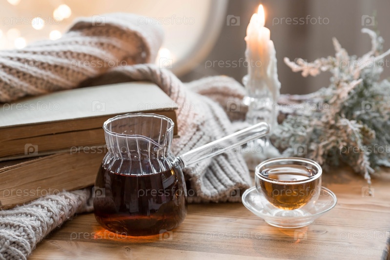 Натюрморт. Старые книги, горячий чай в стеклянной турке, одеяло и горящие свечи на деревянном столе в уютной гостиной. Концепция чайной церемонии. Домашний релакс