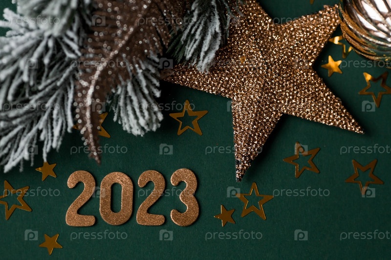 Баннер. С Новым Годом. Золотые числа 2023, еловые ветки, елочные игрушки и золотые звезды на зеленом фоне. Плоская планировка