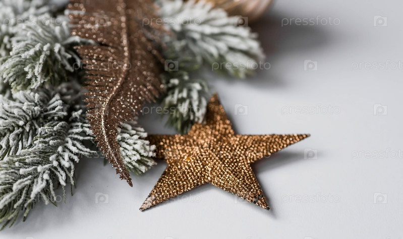 Баннер. С Новым Годом. Золотые числа 2023, еловые ветки, елочные игрушки и золотые звезды на белом фоне. Плоская планировка