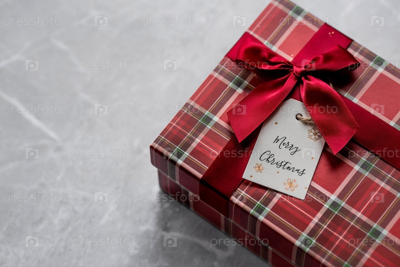 Красная подарочная коробка в клетке и этикетка с надписью "Счастливого Рождества" на фоне серого мрамора. Рождественские праздники 2023. Покупка и подготовка подарков для родных и близких