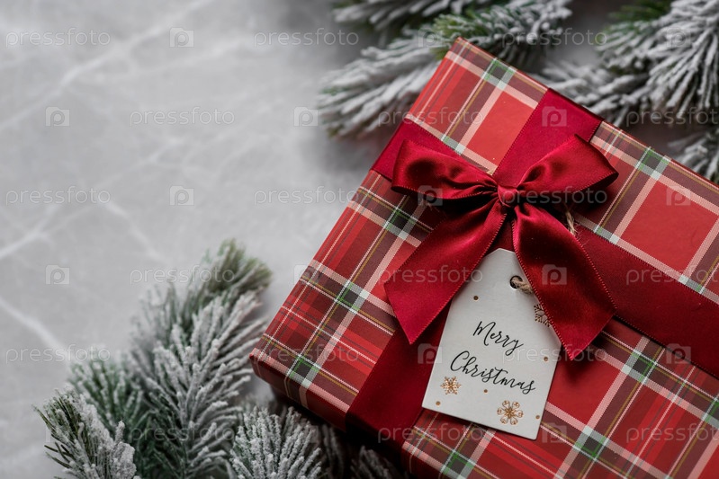 Красная подарочная коробка, еловые ветки, леденец и этикетка с надписью "Счастливого Рождества" на фоне серого мрамора. Рождественские праздники 2023. Покупка и подготовка подарков для родных и близких