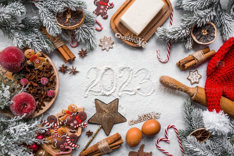С Новым 2023 годом. Баннер с кухонной утварью, рождественскими украшениями, корицей, пряниками и елью на мраморном фоне. Поздравительная открытка на Рождество. Концепция кафе и ресторанов