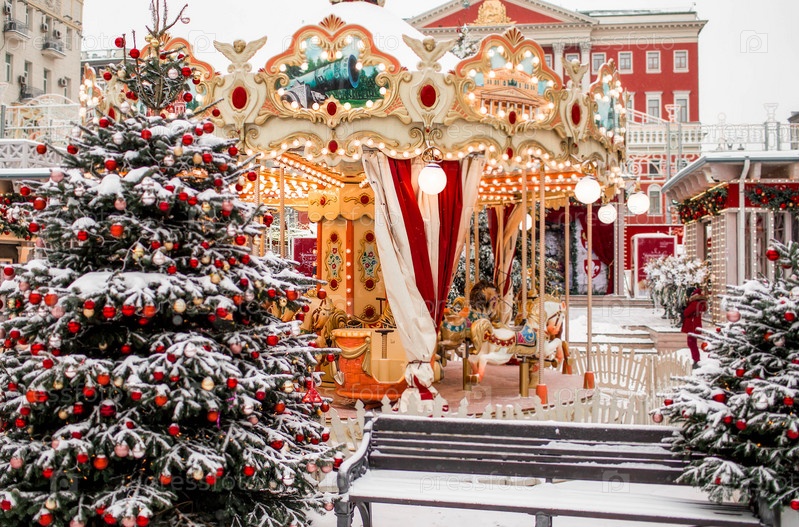 Новогоднее украшение улиц. в классических красно-зеленых тонах. Красивые праздничные пейзажи в городе Москве. Украшенные елки