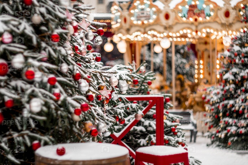 Новогоднее украшение улиц. в классических красно-зеленых тонах. Красивые праздничные пейзажи в городе Москве. Украшенные елки