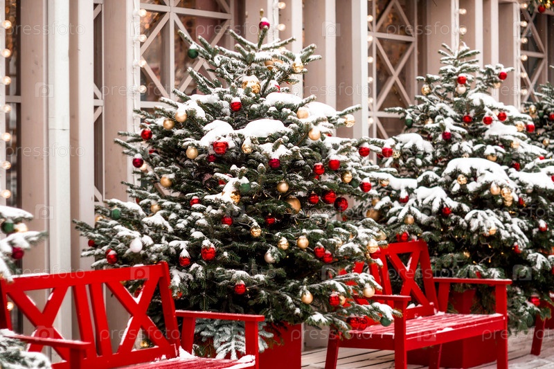 Новогоднее украшение улиц. в классических красно-зеленых тонах. Красивые праздничные пейзажи в городе Москве. Украшенные елки