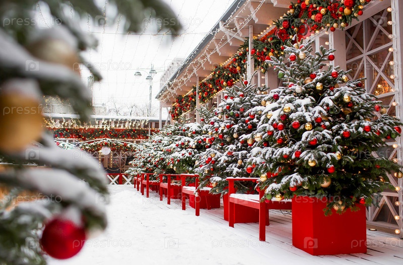 Новогоднее украшение улиц. в классических красно-зеленых тонах. Красивые праздничные пейзажи в городе Москве. Украшенные елки