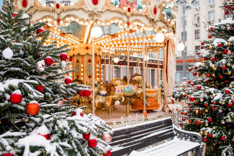 Новогоднее украшение улиц. в классических красно-зеленых тонах. Красивые праздничные пейзажи в городе Москве. Украшенные елки