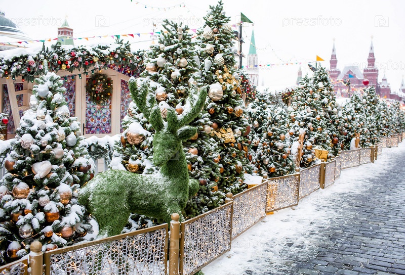 Новогоднее украшение улиц. Красивые праздничные пейзажи в городе. Украшенные елки. Новогодние зимние каникулы 2023
