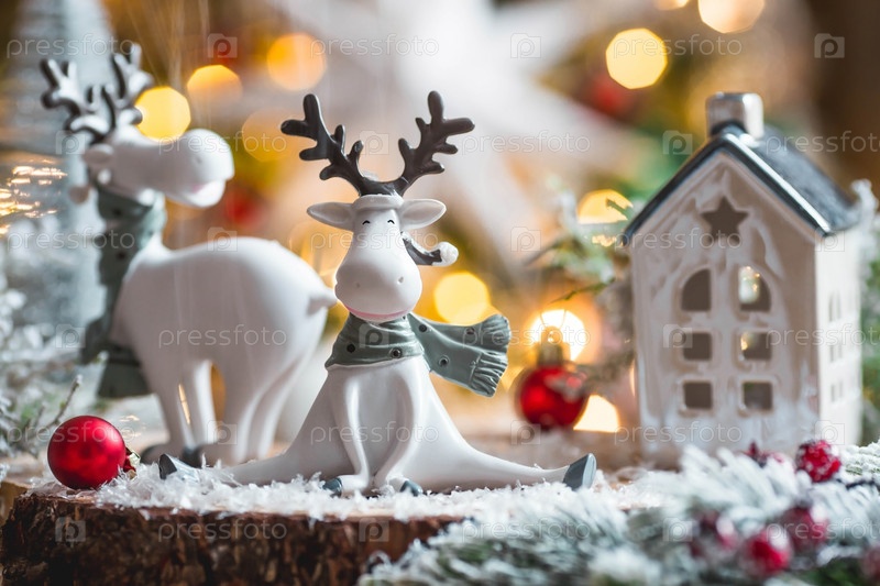 Рождественская открытка с милым оленем на красивом фоне боке. Новогодний натюрморт. Концепция домашнего праздника, тепла и уюта