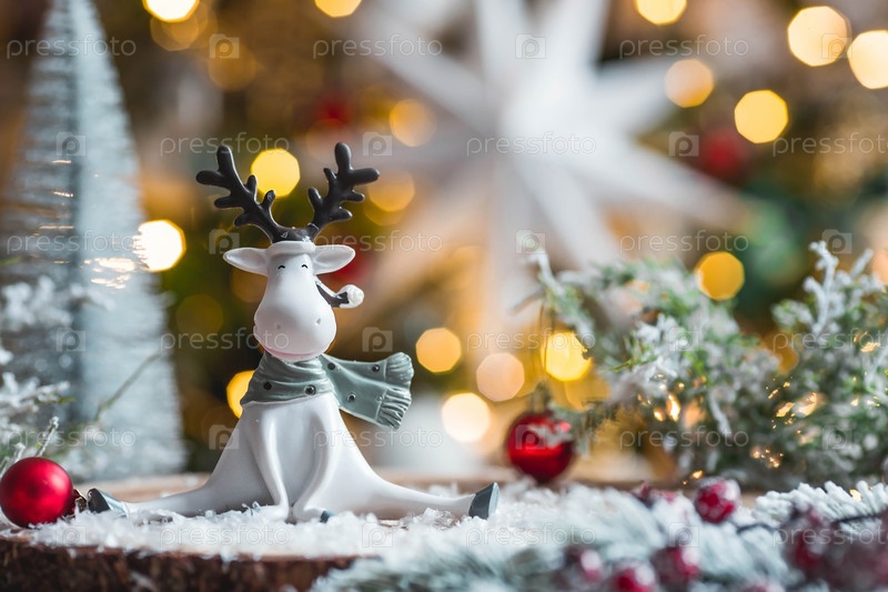 Рождественская открытка с милым оленем на красивом фоне боке. Новогодний натюрморт. Концепция домашнего праздника, тепла и уюта
