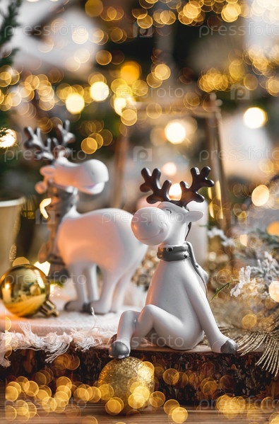 Рождественская открытка с милым оленем на красивом фоне боке. Новогодний натюрморт. Концепция домашнего праздника, тепла и уюта