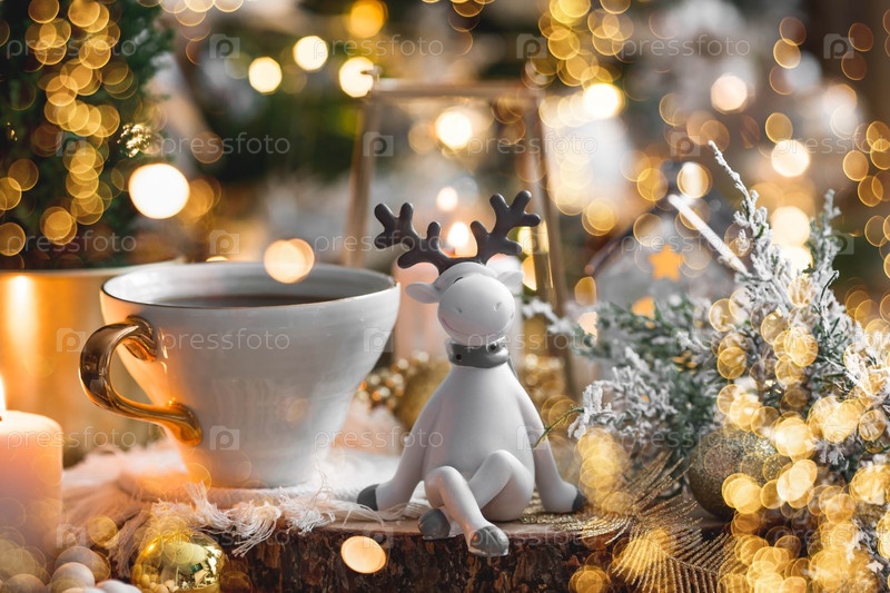 Образ жизни. Чашка чая, елка, свечи и золотые шары на деревянном столе на фоне красивого боке во время рождественских праздников. Натюрморт. Концепция домашнего тепла, уюта