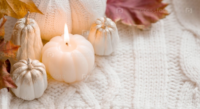 Натюрморт. Вязаная тыква, осенние листья, белый вязаный плед и горящая свеча в виде тыквы. Уютная осенняя концепция