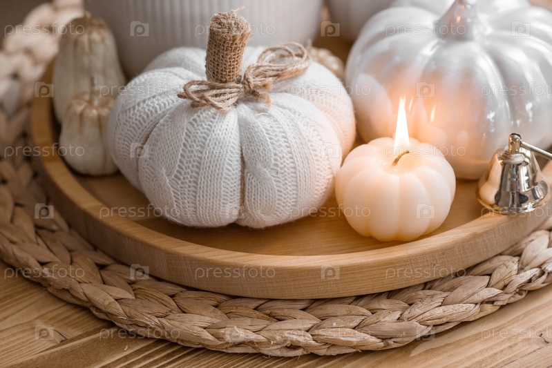 Натюрморт. Вязаная тыква, пампасная трава, свечи в форме тыквы и белые керамические тыквы на деревянном подносе на журнальном столике в домашнем интерьере гостиной. Уютная осенняя концепция