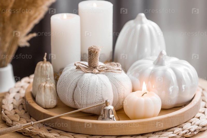 Натюрморт. Вязаная тыква, пампасная трава, свечи в форме тыквы и белые керамические тыквы на деревянном подносе на журнальном столике в домашнем интерьере гостиной. Уютная осенняя концепция