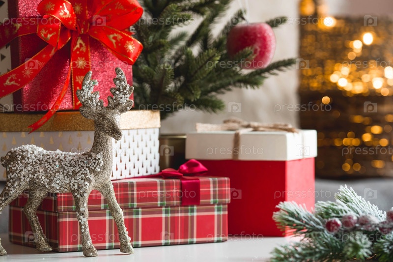 Подарочные коробки и ель на столе в домашнем интерьере гостиной. Уютная концепция новогодних и зимних праздников 2023. Подготовка подарков близким