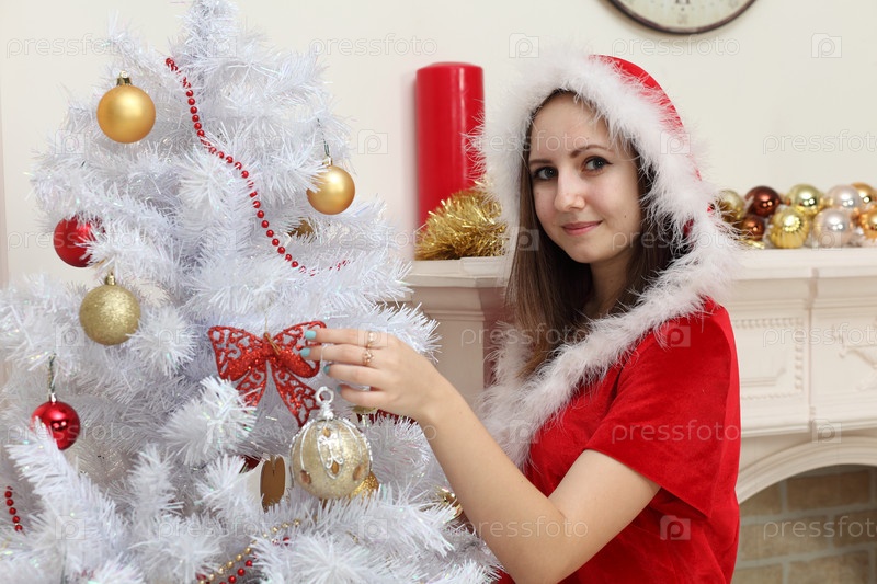 Девушка в костюме Санты на фоне камина около елки