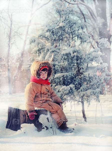 Девочка в зимней одежде сидит под елочкой