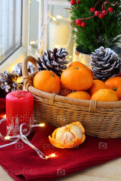 Новогодний натюрморт с мандаринами в корзине и декоративными ягодами