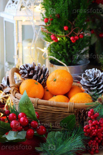 Новогодний натюрморт с мандаринами в корзине и декоративными ягодами
