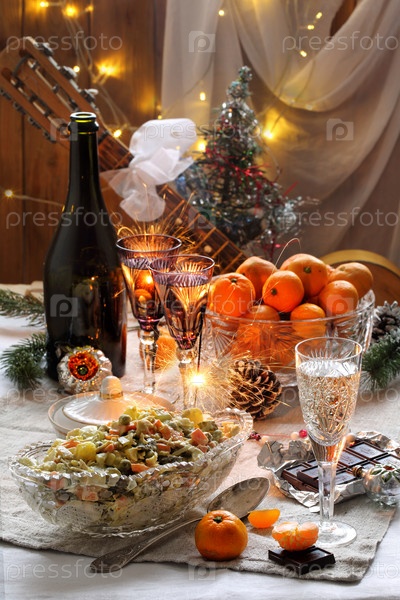 Традиционный русский рождественский салат Оливье с шампанским и мандаринами