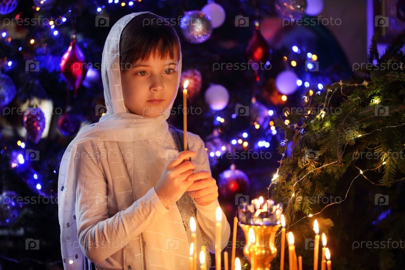 Девочка держит свечу в церкви. Рождество