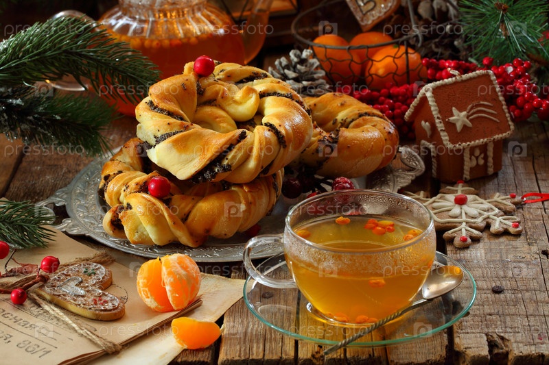 Облепиховый чай с булочками с маком на деревянном фоне