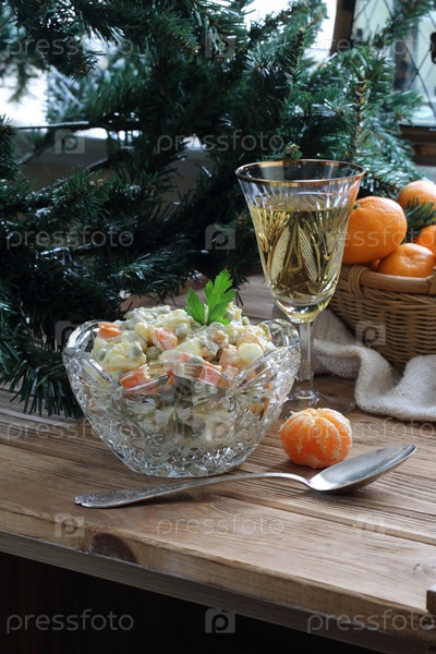 Традиционный русский рождественский салат Оливье с шампанским и мандаринами