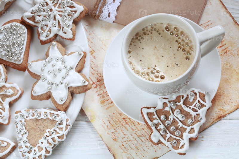 Имбирное печенье с белой глазурью и кофе капуччино