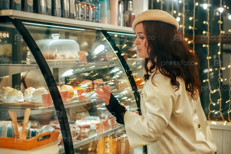 Красивая женщина в белом берет выбирает десерт в кафе