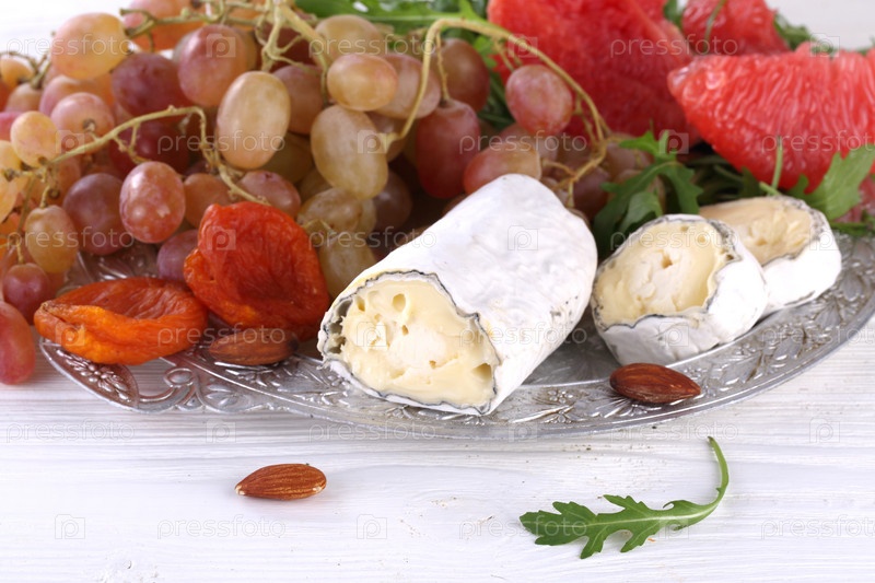 Сыр сент мор де турен с фруктами и рукколой на белом фоне