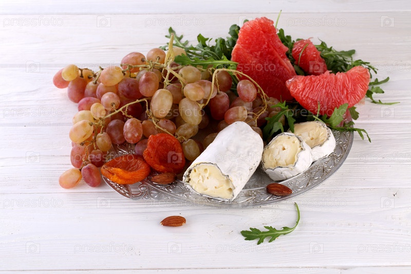 Сыр сент мор де турен с фруктами и рукколой на белом фоне