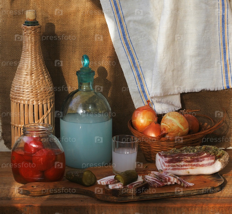 Самогон с салом на деревянном столе